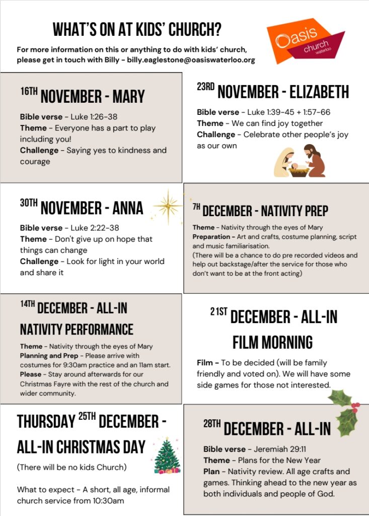 Sunday 14 December – Nativity service (11am), Christmas Fayre (12-2pm), Carols by Candlelight (6pm) at Oasis Church Waterloo A day of Christmas frolics and a night of classic carols – always a busy one, so show up early! Mulled wine and mince pies available!